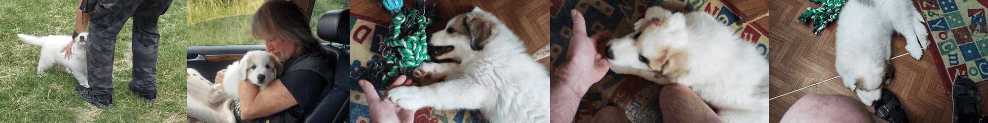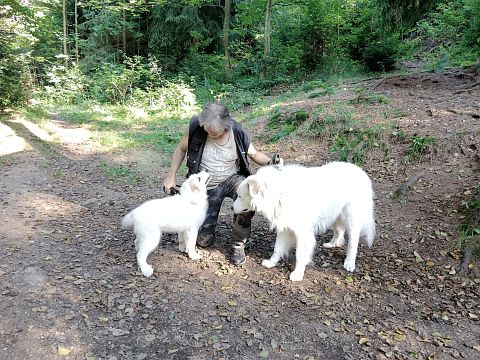 Ze spojení dvou krásných zdravých pyrenejů se trochu netypicky pro toto plemeno (a z neplánovaného vrhu) narodila jen dvě štěňata, bráškové – jeden už byl zamluven a odjel do nového domova o den dříve, ten druhý čekal na mne.