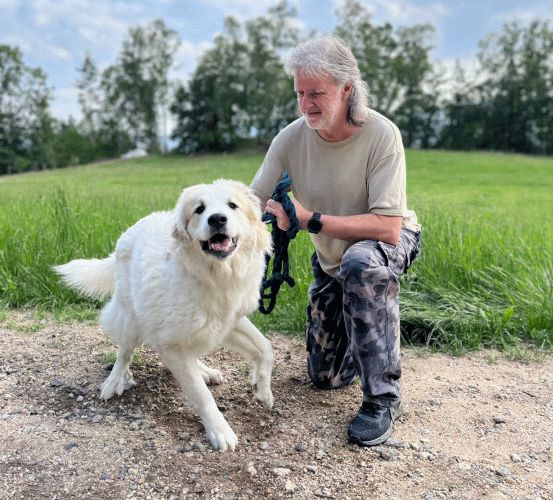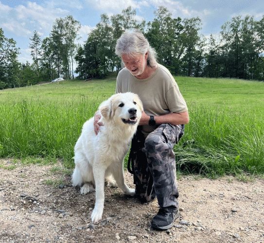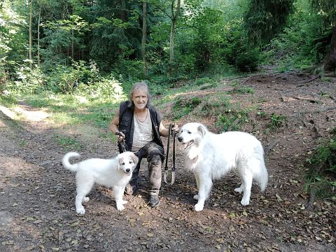 Prvním velkým zážitkem byla po zhruba čtyřech letech návštěva mé klientky s jejím krásným a dnes již sedmiletým pyrenejským parťákem. Pokud je vám pejsek povědomý, pak právem, najdete ho na fotografii na titulní stránce mého webu v koláži „Individuální výcvikový servis“ - v jedné ruce mám jeho, ve druhé svého Gardýska, kterému tehdy bylo osm let a další čtyři úžasné společné roky nás tedy ještě čekaly... Popravdě jsem si nebyl jistý, zda jeho letošní návštěvu vůbec psychicky dám, tak moc mám jeho přítomnost spjatou s Gardýskem a naší společnou fotkou...