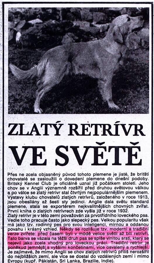 Zlatý retrívr je dnes opravdu chápán více jako plemeno společenské, než pracovní. Stejně jako existují rozdíly ve stavbě těla u jiných plemen (labrador, rotvajler, dobrman atd.), existují i zde. Jenom si myslím, že je trochu ke škodě věci, že rozhodčí dnes na výstavách preferují z valné většiny jedince co nejmohutnější (a týká se to více plemen), bez ohledu na jejich původní poslání. Mně osobně se kdysi na jedné mezinárodní výstavě, kam jsem se přijel s Dinem jen podívat, stalo, že rozhodčí se na něj zběžně podíval a pronesl jediné slovo - "Vykrmit !". Ignorance nebo neznalost? Satisfakcí mi pak bylo, že mne cestou po výstavišti zastavilo několik lidí s dotazem, zda by ode mne nemohli mít psa jako je Dino, že právě takový pes se jim moc líbí...