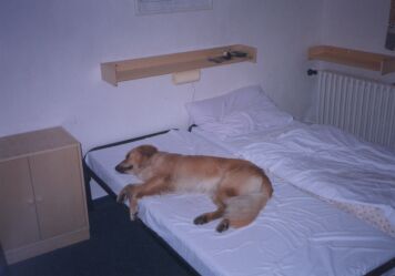 Takže 21.6.1997 nastal ten radostný den,kdy jsem si odvezl svého budoucího čtyřnohého kamaráda, který, jak jsem tehdy ještě nemohl tušit, mi dokonale převrátí život vzhůru nohama. Ale už od samého počátku bylo jasné, že se jedná o vyrovnaného jedince, který bude všechny životní změny brát s naprostým klidem, který je jeho plemeni vlastní. Cestu do nového domova strávil u mne na klíně vedle jezevčíka mé známé, která se uvolila nás svým vozem dopravit domů. Již první noc v novém prostředí byl v pohodě, po sourozencích a mámě se mu evidentně nestýskalo a byl nadšený z toho, že má svou misku a svého pána. Já naopak nezamhouřil oka, protože už jako v malém štěněti v něm byl zaklet průzkumník, takže celou noc brouzdal bytem, nechávaje za sebou v pravidelných intervalech loužičky a bobky. Ale jedno jsem již věděl určitě. Že moje rozhodnutí bylo správné a že udělám vše pro to, aby svůj psí život prožil šťastný, spokojený a naplno.